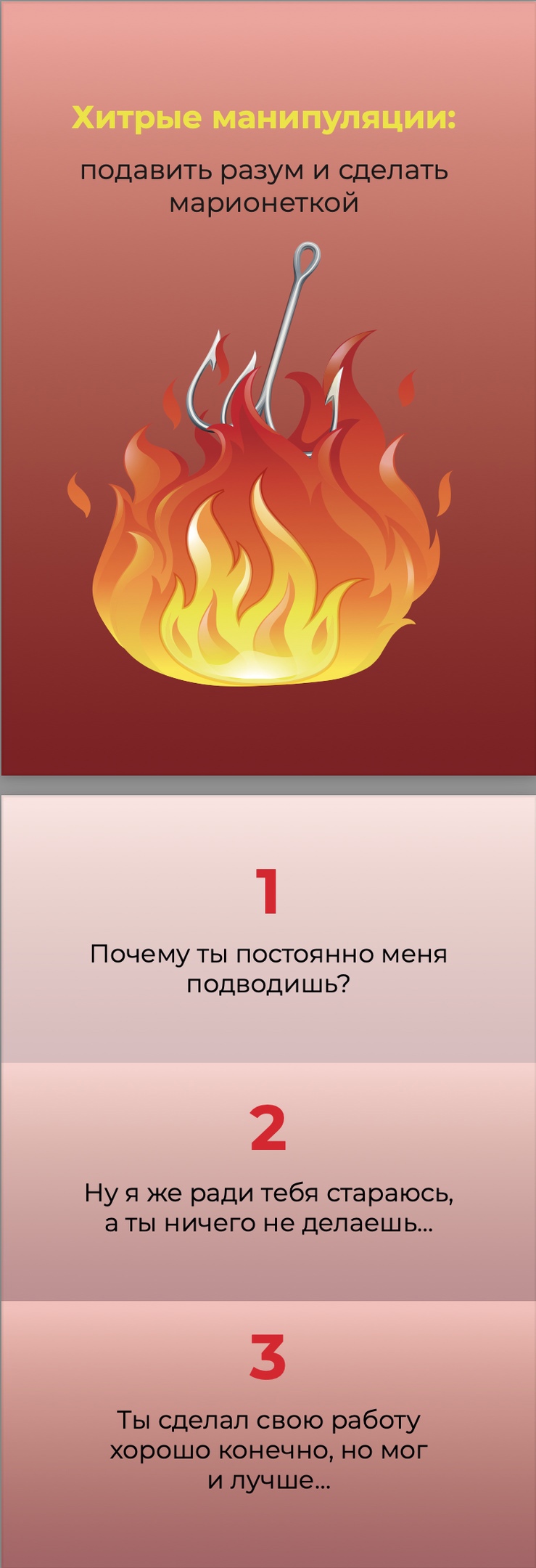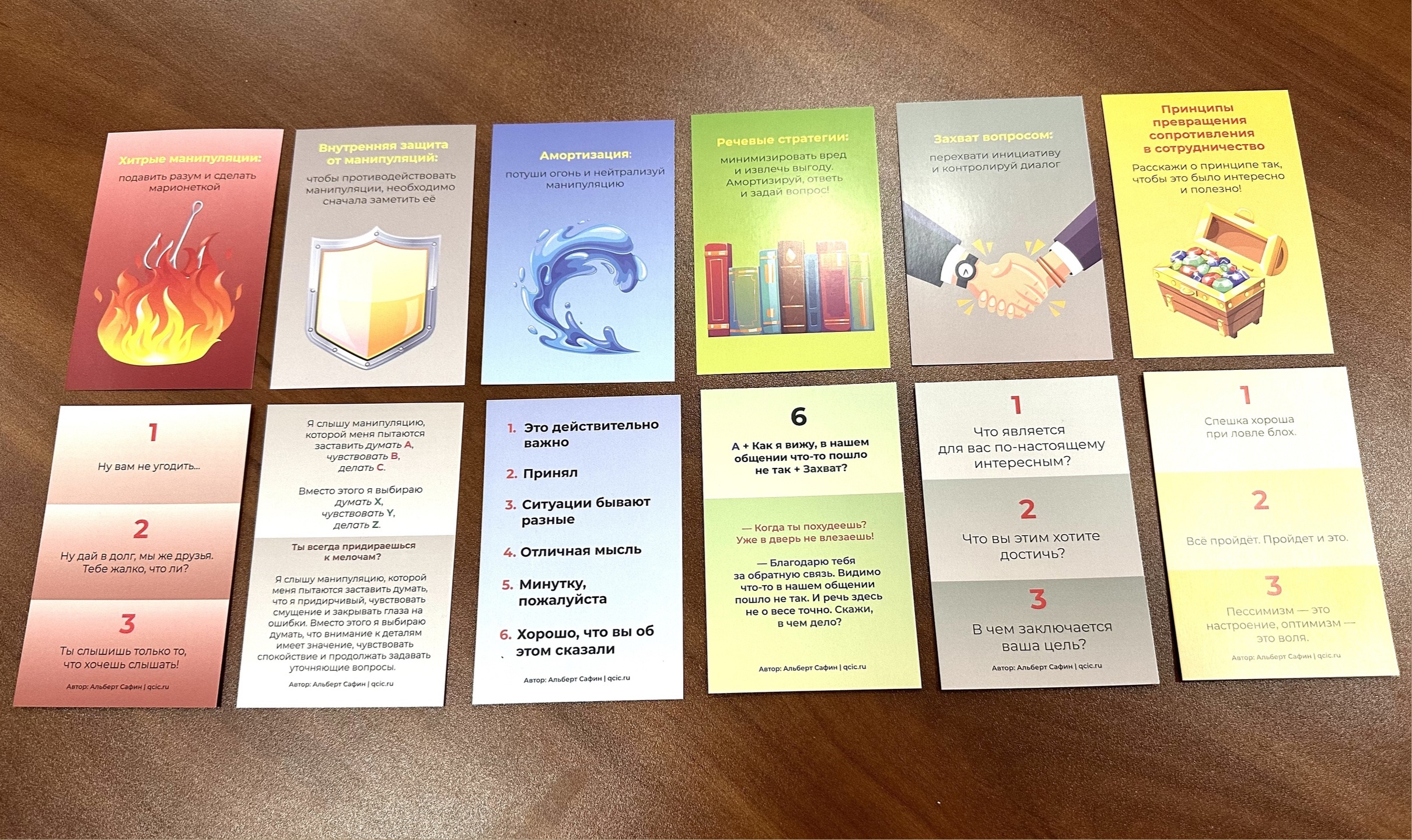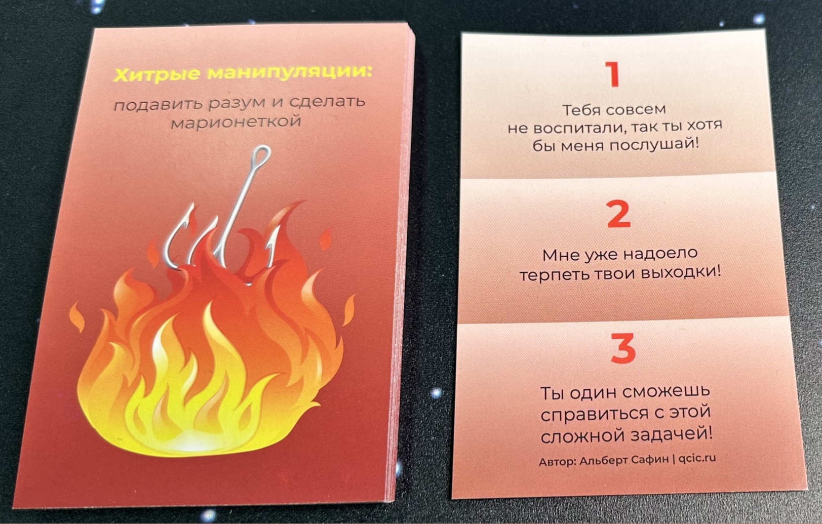 Шаг 3 - возьмите, пожалуйста, одну из карточек из колоды «Хитрые манипуляции: подавить разум и сделать марионеткой». Раздайте каждому участнику по одной карточке из этой колоды. На карточке вы видите три манипуляции. Прочтите первую манипуляцию и вскройте её, используя карточку из колоды «Внутренняя защита от манипуляций». Покажите пример участникам. Пригласите участников вскрыть по одной манипуляции. Повторите этот шаг.