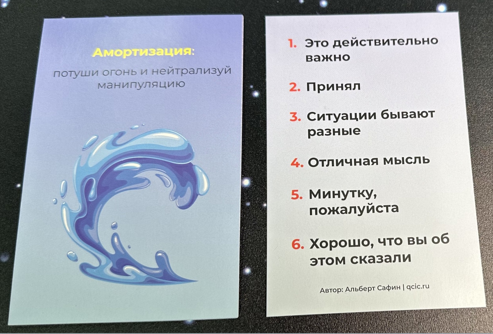 Шаг 4 - возьмите, пожалуйста, одну из карточек из колоды «Амортизация: потуши огонь и нейтрализуй манипуляцию». Расскажите о значении этой карточки. Прочтите вслух манипуляцию и амортизируйте её любым из вариантов. Задайте вопрос участникам: для чего необходима амортизация? Раздайте участникам по одной карточке из этой колоды. Пригласите участников амортизировать по одной манипуляции. Повторите этот шаг.