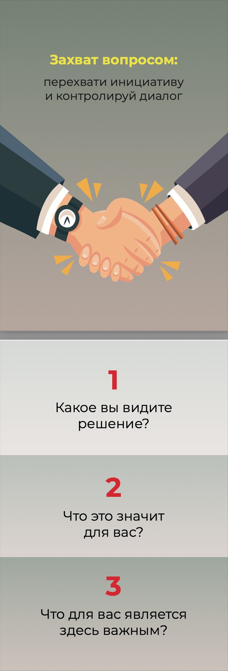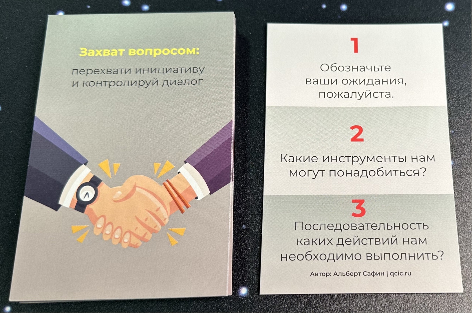 - 25 карт с 75 примерами открытых вопросов для перехвата инициативы;
