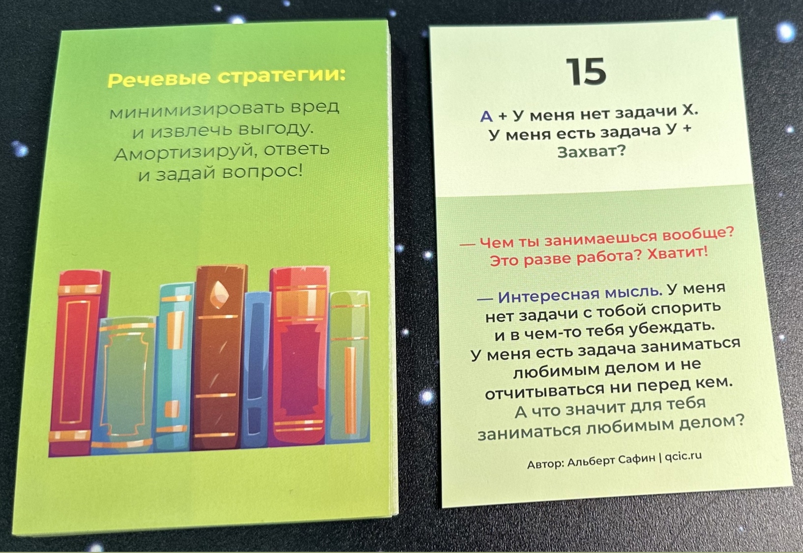 Книга может быть полезной как дополнительный учебный материал к тренажеру. Особенно полезным будет раздел «Речевые стратегии: разбор ситуаций с примерами» (страницы: 8 - 137). Ситуации из книги вы можете разбирать как самостоятельно, так и с участниками игры. Я приглашаю вас изучить разобранные ситуации в книге, увидеть там крючки и варианты ответов на них.