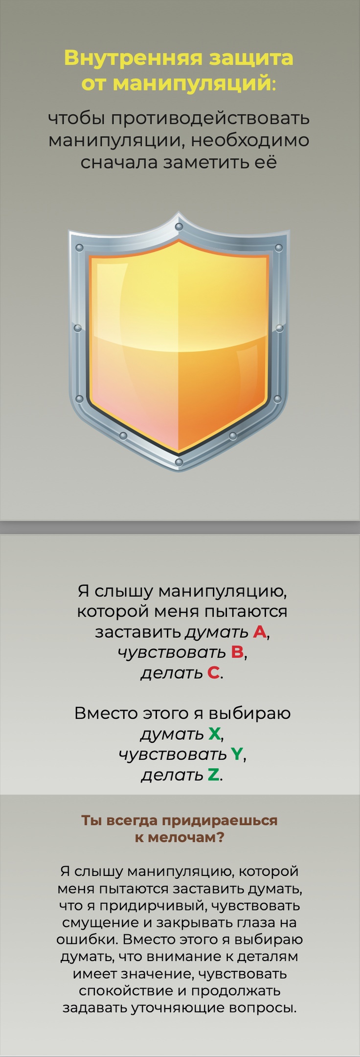 В этом уроке я подробно раскрываю механику «Внутренняя защита от манипуляций»: я слышу манипуляцию, которой меня пытаются заставить думать 1, чувствовать 2 и делать 3. Я свободный человек и я выбираю думать 4, чувствовать 5 и делать 6. Задача этой механики в том, чтобы тренировать свою чувствительность и наблюдательность к манипуляциям. Человек может противодействовать только тому, что он осознает.